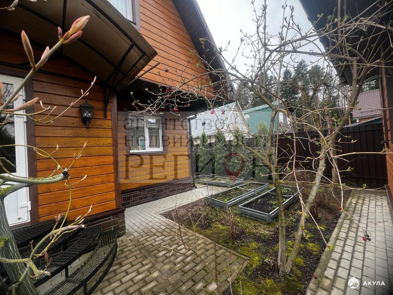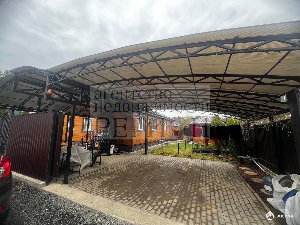 Ландшафт: дорожки из брусчатки, парковочные места под навесом, теплица, взрослые плодовые деревья и декоративные кустарники.